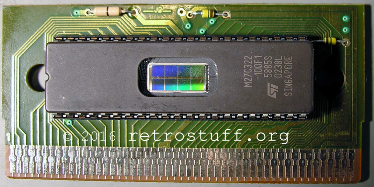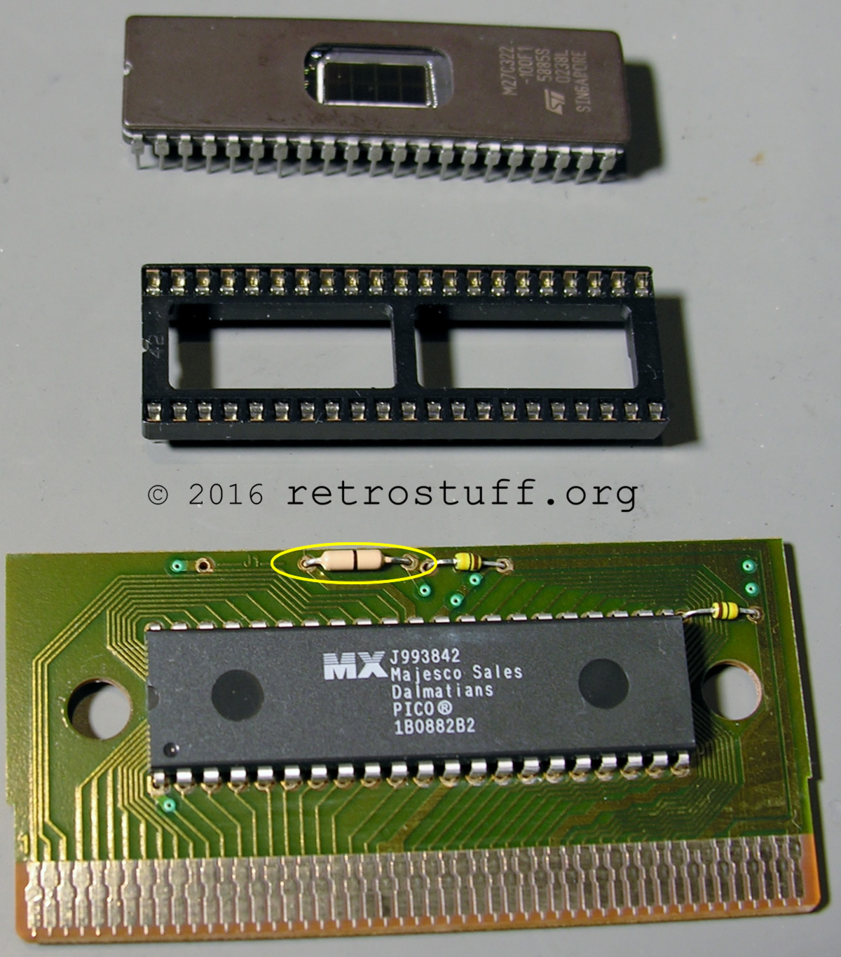 Remove the chip and replace it with a 42-pin socket and one or more M27C322 EPROMs, and move the resistor from J2 to J1.