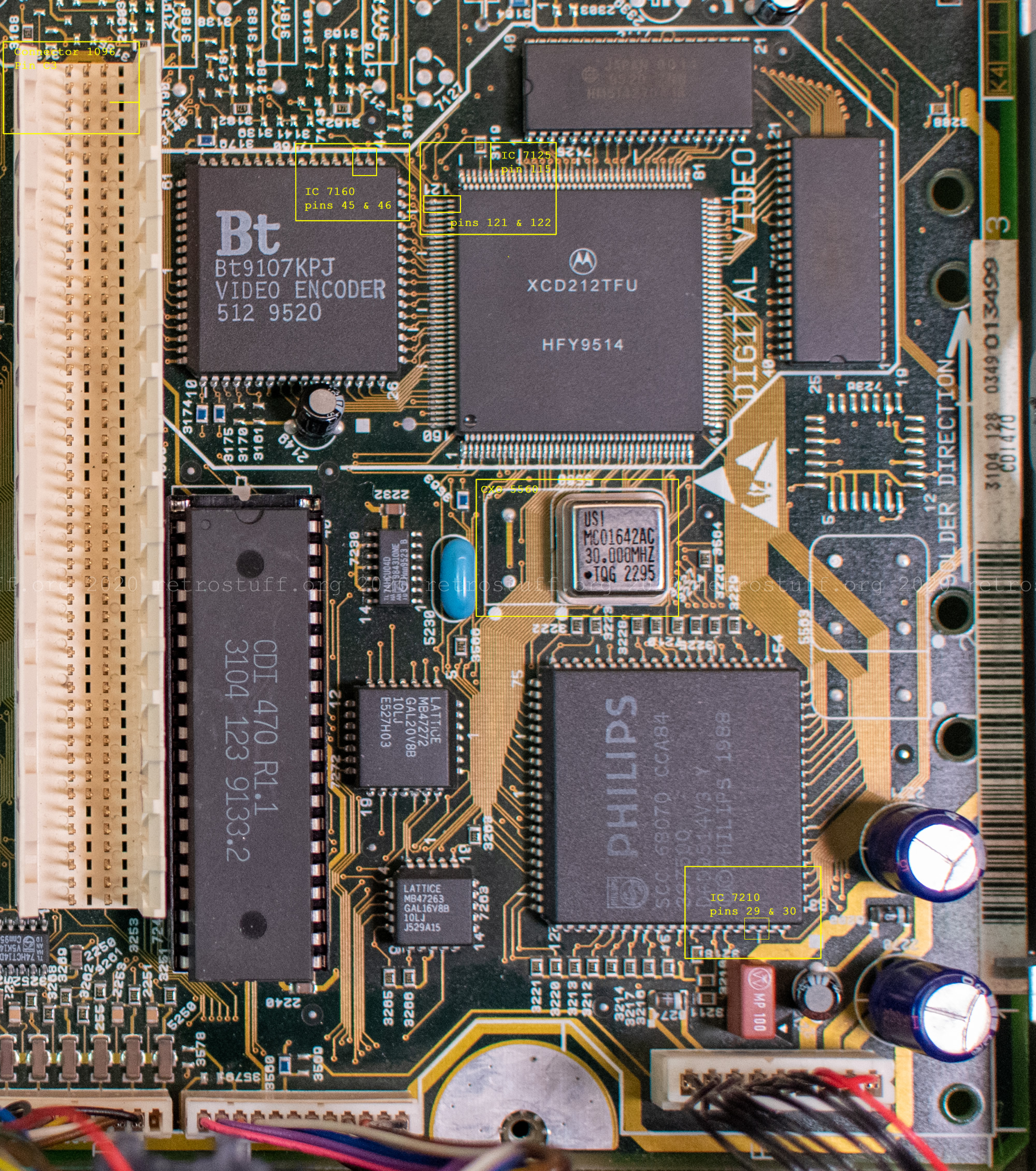 When we modify/switch a PAL CD-i player to 60 Hz without changing these crystals/oscillators as well, then we not only lose the colour, we also never reach 60 Hz (NTSC is actually 59,94 Hz, but we will round it up). It is always slightly below (e.g. 59,5 Hz on my CDI470). This affects other game consoles as well, by the way, and can be troublesome for some modern TVs and video processors.